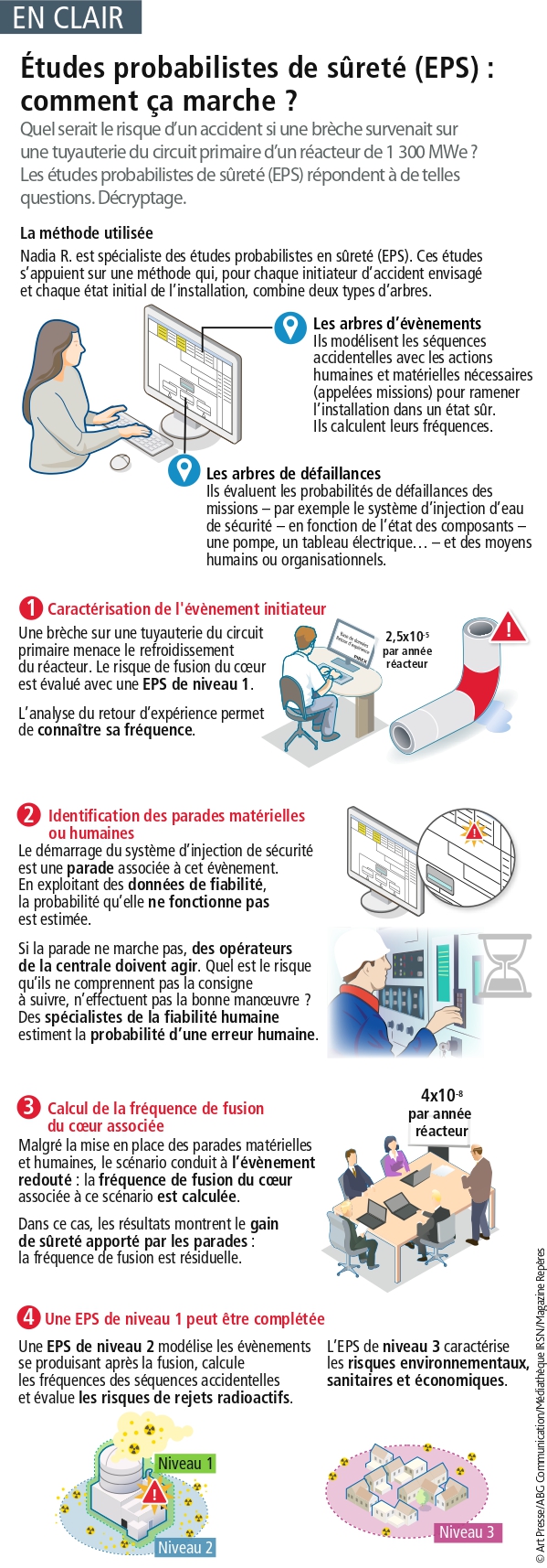 Conception, réexamens périodiques, conduite d’un réacteur… À toutes ces étapes, les études probabilistes de sûreté (EPS) sont devenues essentielles à la sûreté des réacteurs en France. Elles quantifient les probabilités de fusion du cœur – étude de niveau 1 –, l’amplitude et les probabilités de rejets radioactifs dans l’environnement – étude de niveau 2 (voir infographie).