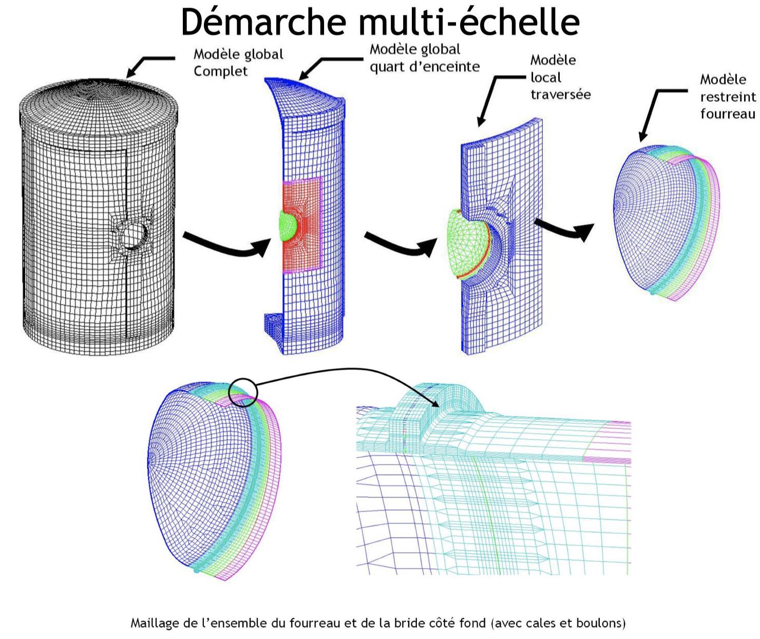 Entre 2004 et 2009, à l’occasion du réexamen périodique associé aux troisièmes visites décennales des réacteurs de 900 MWe, EDF réalise notamment des EPS de niveau 2 pour évaluer les risques de rejets en cas d’accident de fusion du cœur. L’Institut les expertise et poursuit le développement de ses propres études, lancées à la fin des années 1990. En particulier, pour évaluer le comportement des enceintes de confinement, les spécialistes de l’IRSN recourent à des modèles en cascade, dits multi-échelles. « Le travail débute avec le modèle complet de l’enceinte, puis se focalise sur l’emplacement du point faible identifié. La modélisation se poursuit vers des structures individuelles – fourreau, couche de recouvrement dite liner, etc. – et parvient aux boulons fermant le tampon d’accès matériel de l’enceinte. Cette démarche permet d’isoler, depuis un ensemble, une singularité susceptible de favoriser un rejet direct de radioactivité, décrit Georges Nahas, expert des EPS. En l’occurrence, nos calculs révèlent une mauvaise résistance à la déformation du tampon d’accès matériel. »