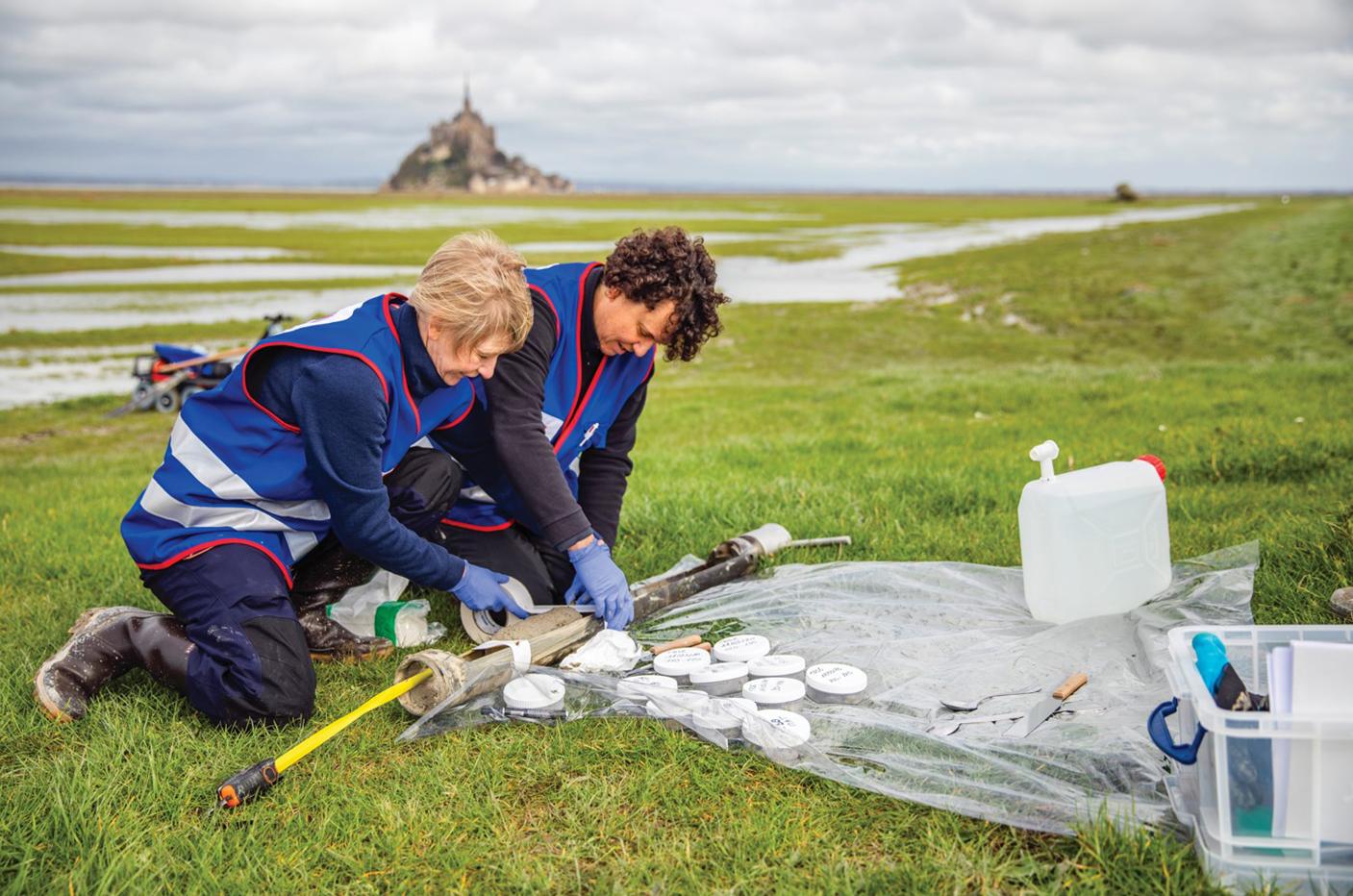 Les radioécologistes Philippe Laguionie (à gauche) et Denis Maro (à droite) retirent un carottier du sol, dans la baie du Mont-Saint-Michel (Manche). Les carottes de sédiments permettent de reconstituer l’historique des rejets de radionucléides en mer. - © Célia Goumard/Médiathèque IRSN