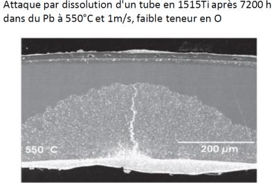 Des recherches restent nécessaires pour expertiser le comportement des matériaux utilisés par les SMR les plus innovants. Ici la corrosion de tubes en acier par du plomb à 550 °C. - © Source: Müller (2005).