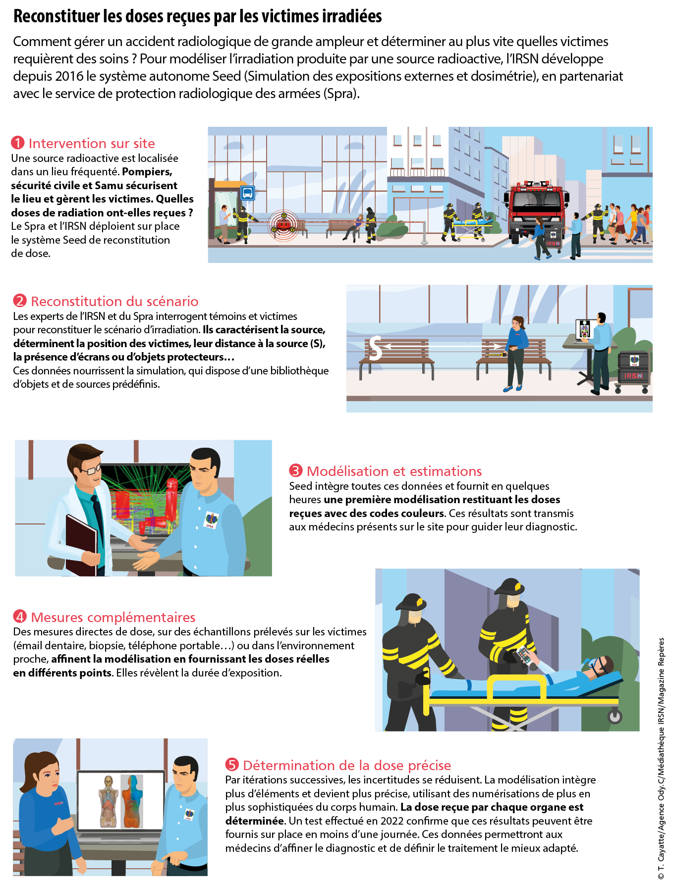 Comment gérer un accident radiologique de grande ampleur et déterminer au plus vite quelles victimes requièrent des soins ? Pour modéliser l’irradiation produite par une source radioactive, l’IRSN développe depuis 2016 le système autonome Seed (Simulation des expositions externes et dosimétrie), en partenariat avec le service de protection radiologique des armées (Spra).