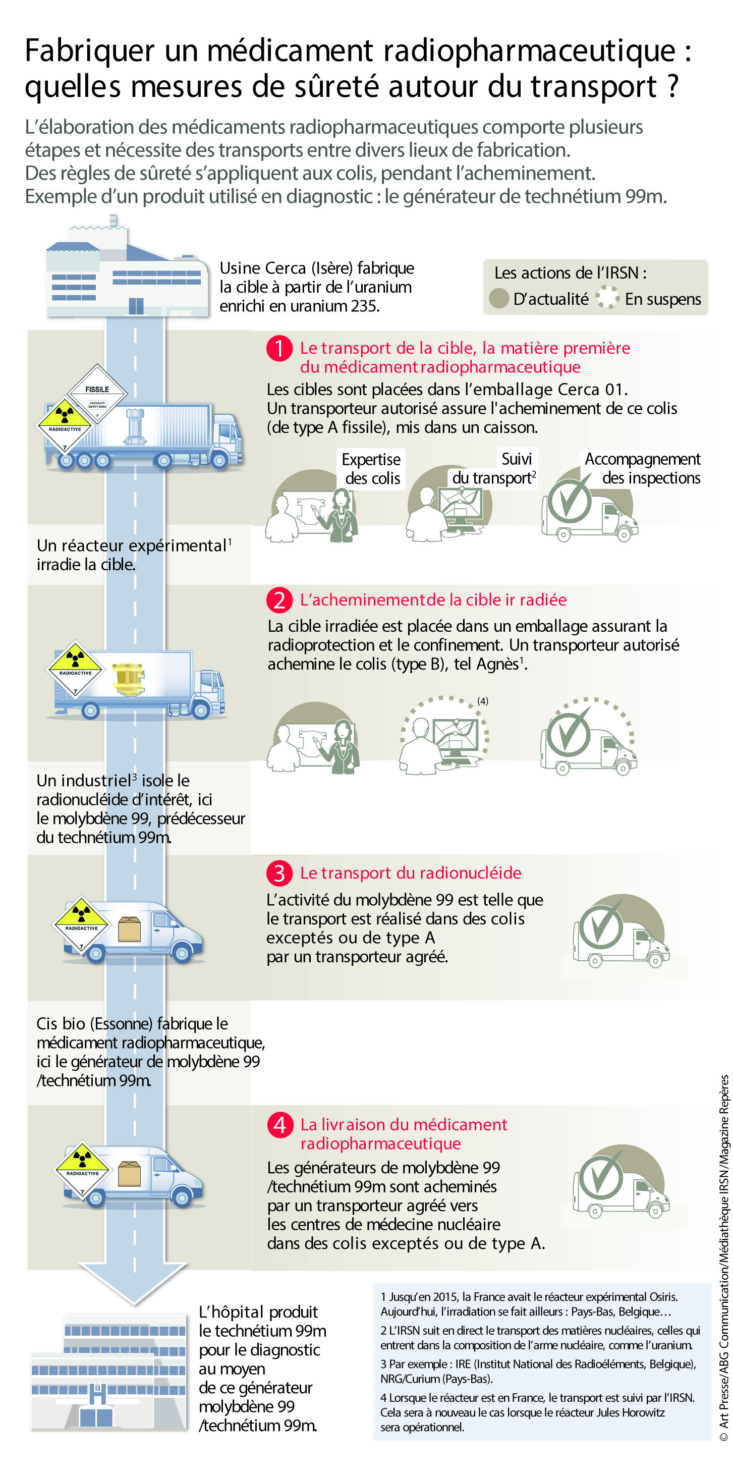 L'élaboration des médicaments radiopharmaceutiques comporte plusieurs étapes et nécessite des transports entre divers lieux de fabrication. Des régles de sûreté s'appliquent aux colis pendant l'acheminement. Exemple d'un produit utilisé en diagnostic : le générateur de technétium 99.