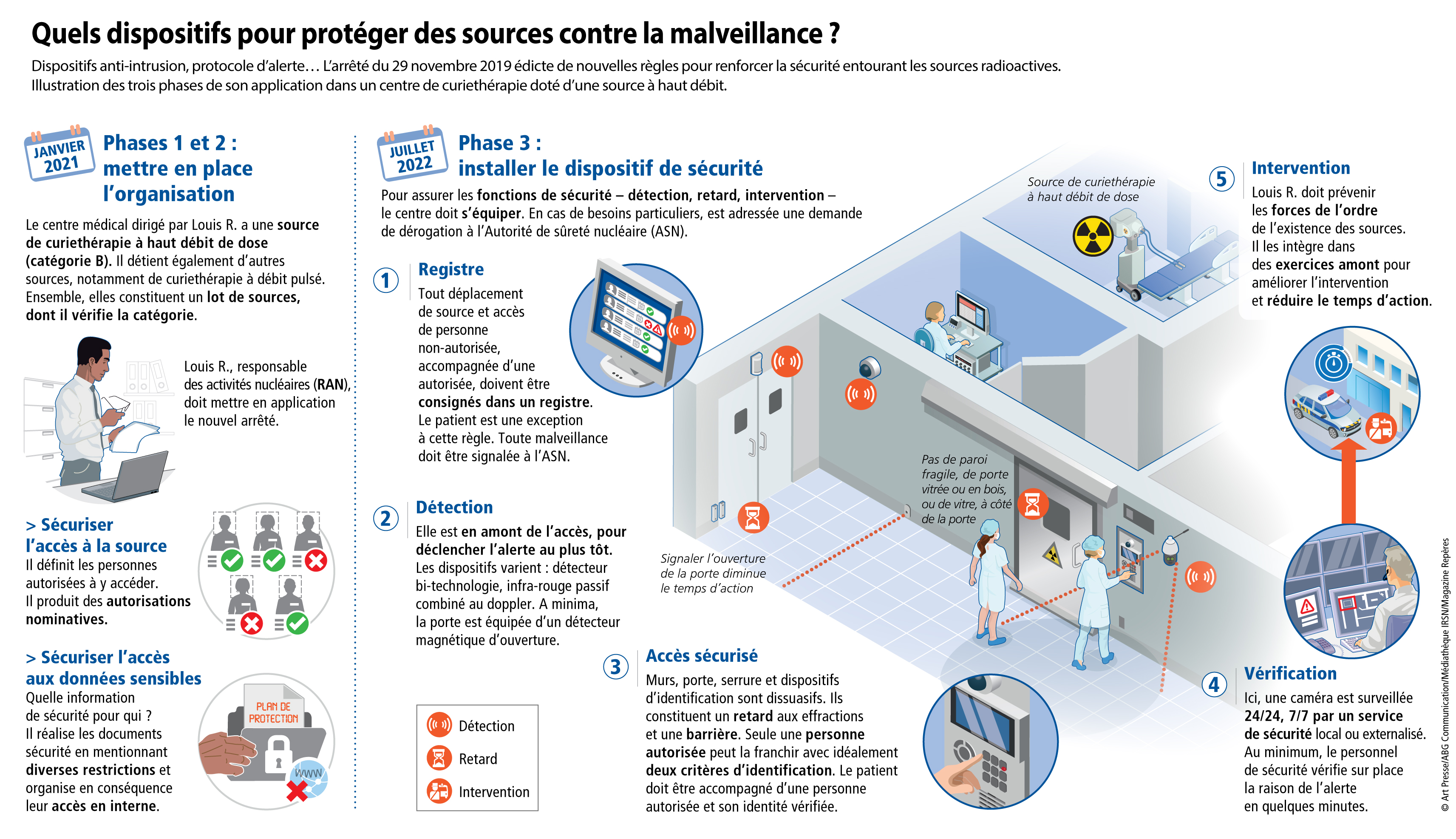 Dispositifs anti-intrusion, protocole d’alerte… L’arrêté du 29 novembre 2019 édicte de nouvelles règles pour renforcer la sécurité entourant les sources radioactives. Illustration des trois phases de son application dans un centre de curiethérapie doté d’une source à haut débit.