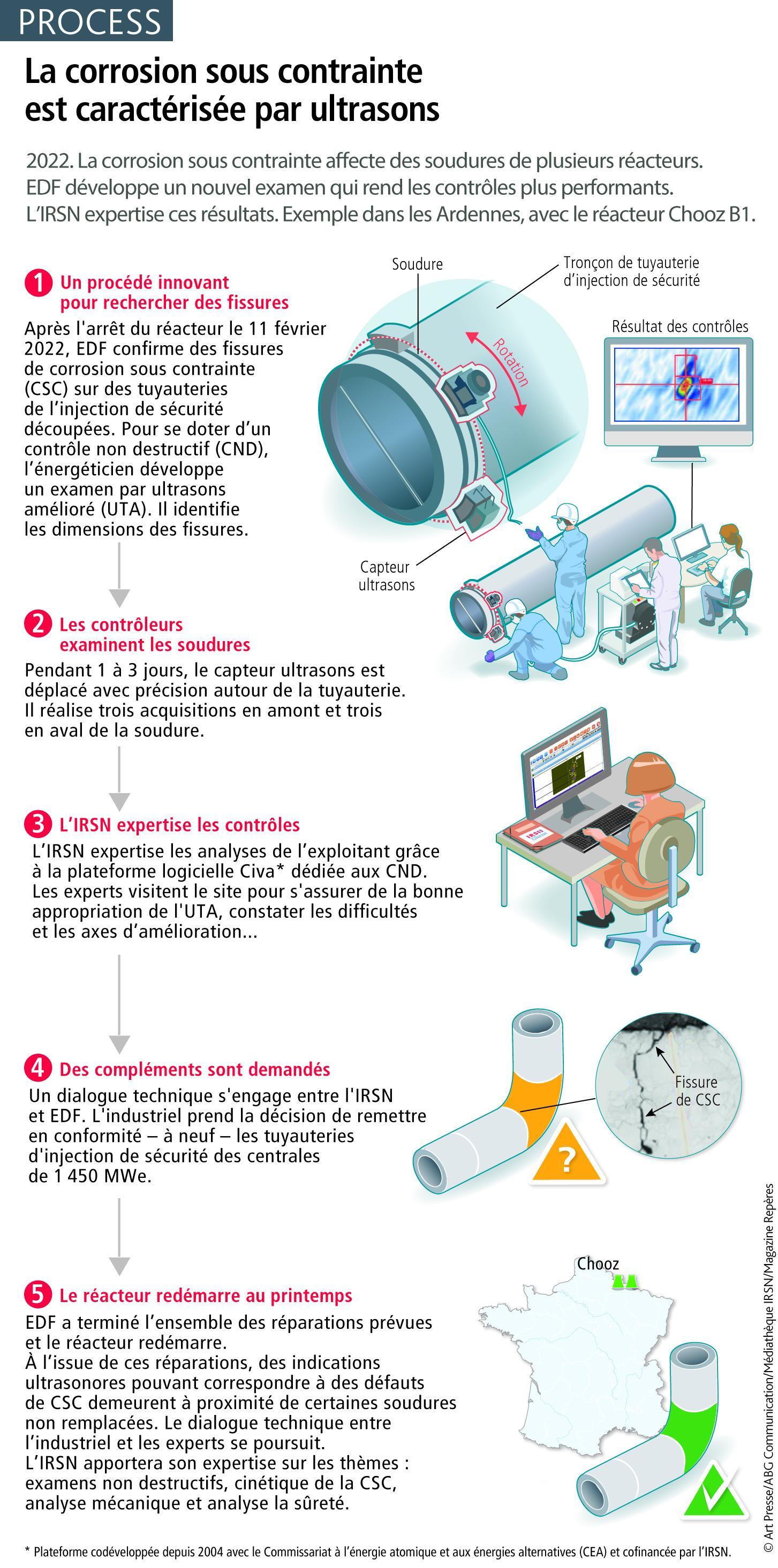 2022. La corrosion sous contrainte affecte des soudures de plusieurs réacteurs. EDF développe un nouvel examen qui rend les contrôles plus performants. L'IRSN expertise ces résultats. Exemple dans les Ardennes, avec le réacteur Chooz B1.