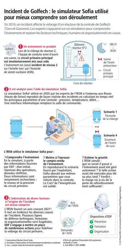 En 2019, un incident affecte la vidange d'un réacteur de la centrale de Golfech (Tarn-et-Garonne). Les experts s'appuient sur un  simulateur pour comprendre l'évènement et repérer les facteurs techniques, humains et organisationnels en cause.
