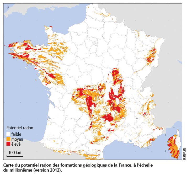 “En France, les zones riches en radon sont les Vosges, le Massif central, la Bretagne et la Corse”, souligne Didier Gay. À la suite de campagnes de mesures effectuées dans l’habitat entre les années 1980 et 2000, 31 départements, comme la Haute-Vienne ou la Lozère, ont été classés prioritaires car fortement exposés. L’exploitation des données géologiques permet aujourd’hui de disposer d’une cartographie plus précise des zones les plus concernées. Pour connaître le potentiel radon de sa commune, il suffit de consulter la cartographie réalisée par l’IRSN sur www.irsn.fr/carte-radon. Elle indique les zones où des concentrations élevées dans les habitations sont plus probables. D’autres facteurs rentrent en jeu : structure du bâtiment, ventilation et habitudes des occupants en matière d’aération ou de chauffage.