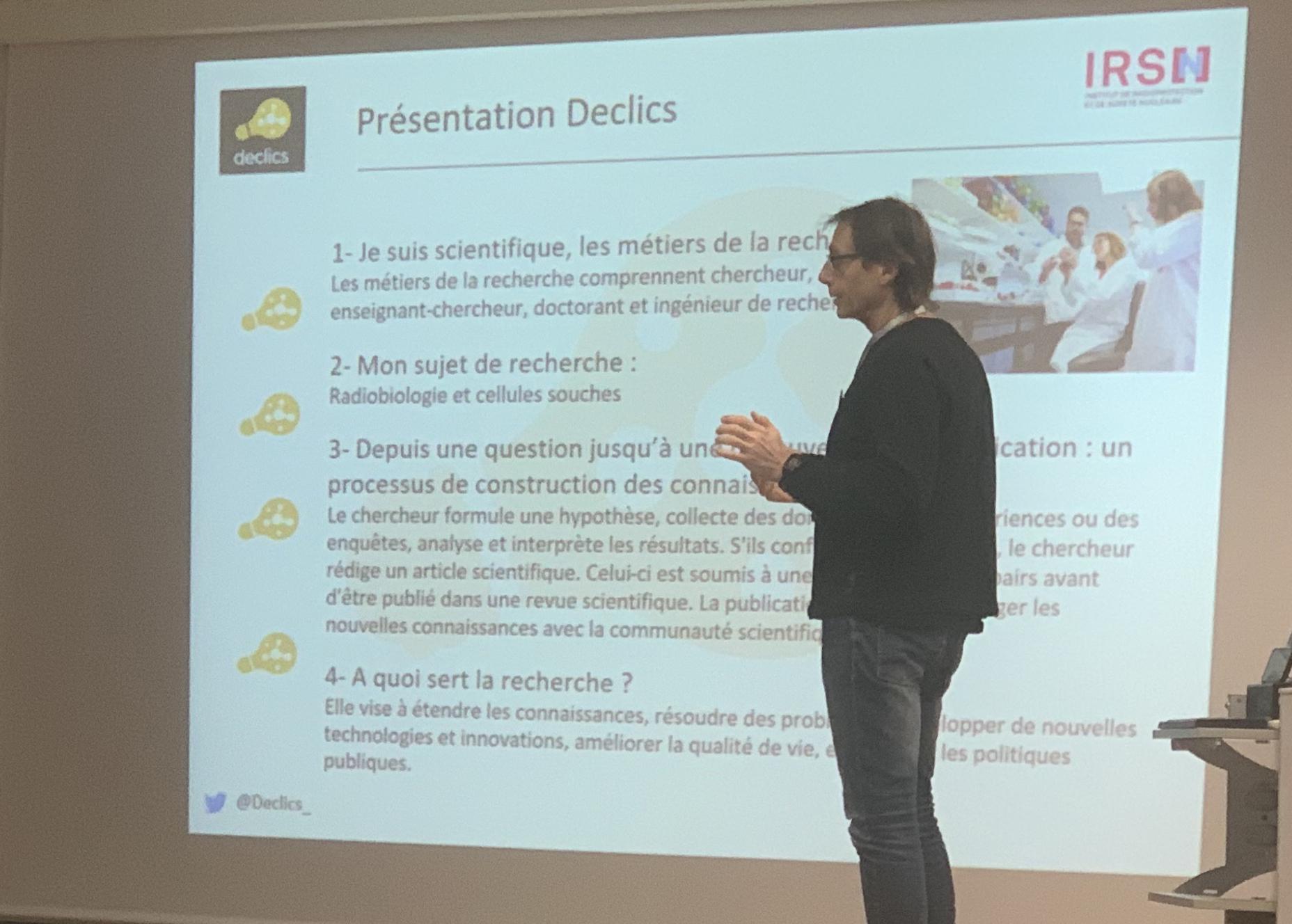 Début 2023, des élèves du lycée Jacques-Monod, situé tout près du siège de l’IRSN à Fontenay-aux-Roses, participent aux ateliers de radioprotection animés par Alain Chapel, chercheur en radiobiologie. Un succès sur lequel Étienne Brousse, professeur principal d’une classe de première et enseignant de SVT3 entend bien capitaliser : « Le Cercle FSER m’a contacté pour participer au dispositif Declics dans le cadre d’heures consacrées à l’orientation. C’est une excellente occasion de faire découvrir aux élèves toute la diversité des métiers de la recherche et de déconstruire au passage les stéréotypes sur les chercheurs. » Il reprend contact avec l’IRSN, qui sélectionne en interne des ambassadeurs pour représenter une grande palette de métiers et de profils : sismologue, sociologue, physicien modélisateur, biologiste, technicien, thésard, chargé de recherche…