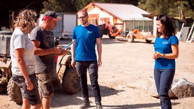 Deux techniciens chargés des prélèvements alimentaires expliquent le principe de l’Etude radiologique de site (ERS) à une famille de maraîchers à Saint-Alban-du-Rhône (Isère). - © Célia Goumard/Médiathèque IRSN