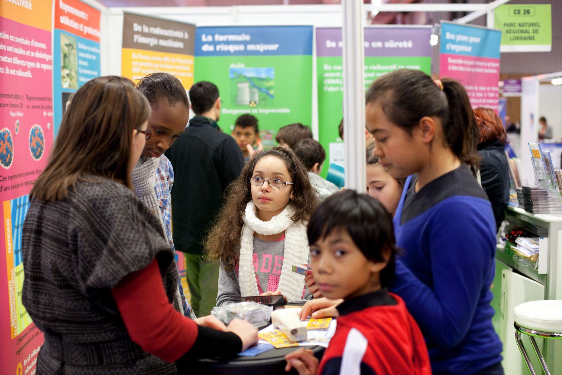 Sur le Salon de l’Éducation, Evelyne Allain de l'Institut français des formateurs risques majeurs et protection de l’environnement (Iffo-RME) sensibilise les jeunes à la prévention du risque radiologique. - © Frédérique-Elsa Hugues/Médiathèque IRSN