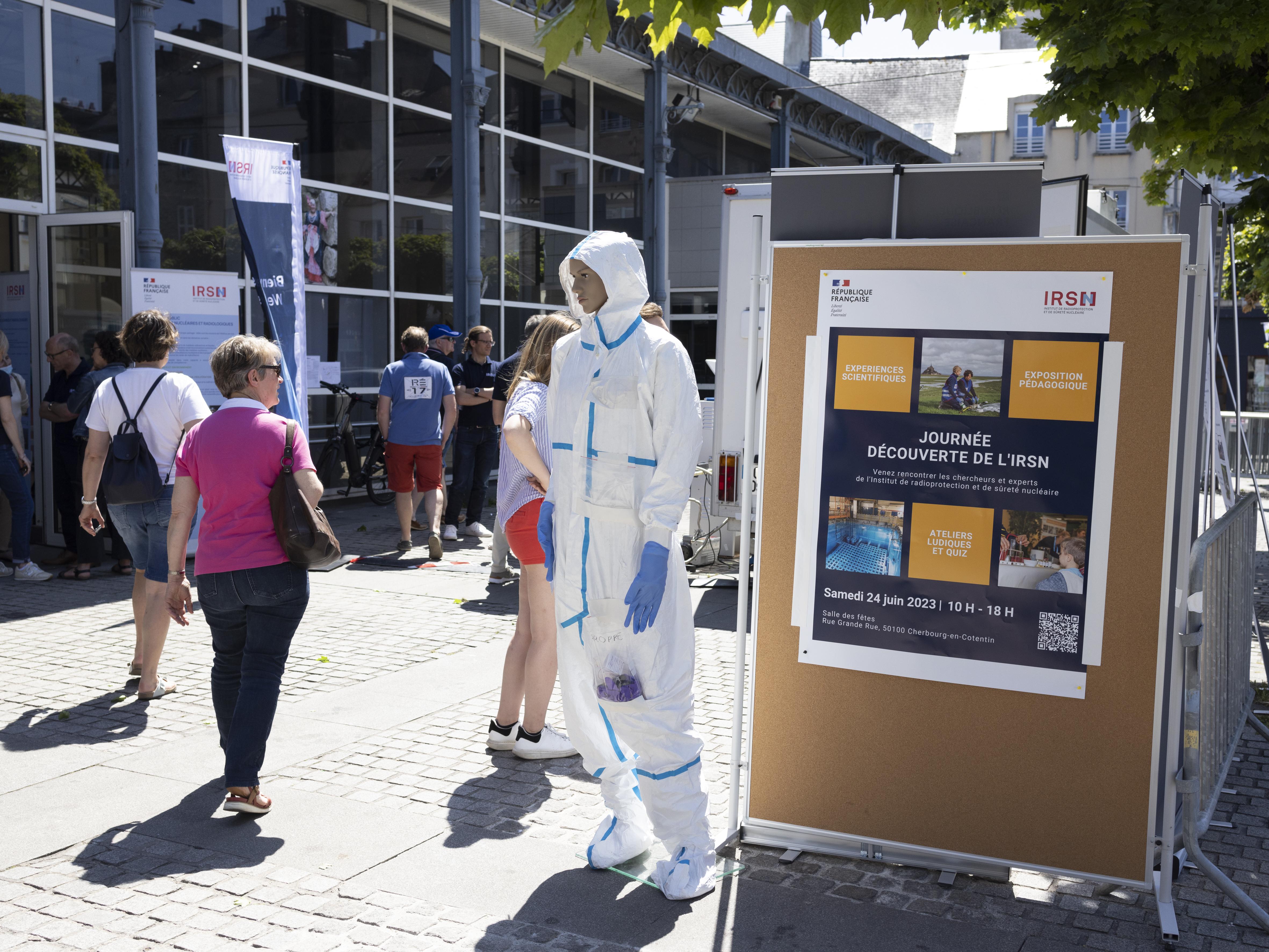 « Dans le Cotentin, la radioactivité et le nucléaire, on grandit avec. Avec l’usine de La Hague, la centrale de Flamanville, le site de l’Andra1 et même les sous-marins construits à Cherbourg, nous sommes tous touchés d’une façon ou d’une autre », évoque Sandrine, assistante de direction, alors qu’elle parcourt l’exposition organisée par l’IRSN à la salle des fêtes de Cherbourg le 24 juin 2023. Si ce jour-là les rangs des visiteurs comptent aussi des vacanciers et des touristes étrangers, la plupart sont en effet des habitants du Cotentin. On y passe en famille, en couple ou entre amis pour découvrir l’événement et en apprendre davantage sur la radioactivité, le nucléaire et la radioprotection. Toute la journée, une trentaine de salariés de l’IRSN, parmi lesquels des experts du Laboratoire de radioécologie de Cherbourg (LRC), échange avec la population et anime des ateliers présentant les méthodes de suivi environnemental et les instruments utilisés en radioprotection et prévention des risques.