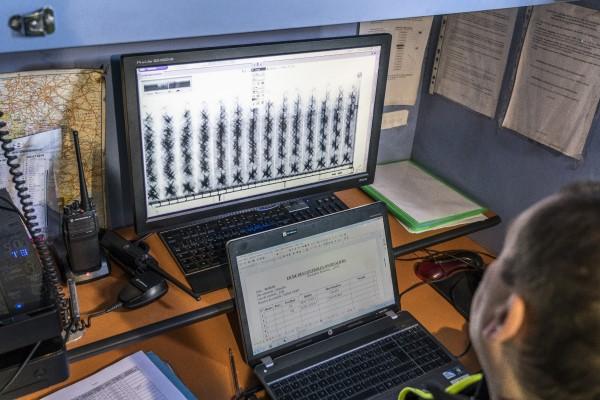 Elles forment un rectangle de 40 mètres sur 30. Si le signal entre elles est rompu, le scan ne peut pas démarrer ou s’interrompt automatiquement. Un écran est installé dans la cabine image du camion pour visualiser le périmètre : si le rectangle est vert, le périmètre est sécurisé, s’il s’affiche en rouge, il y a eu intrusion et le scanner s’arrête. Une douzaine de boutons d’urgence permettent un arrêt manuel à tout moment.