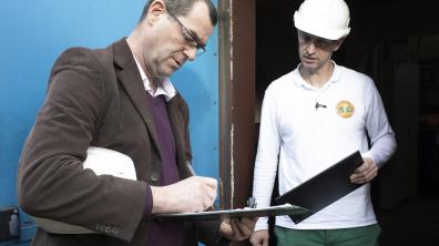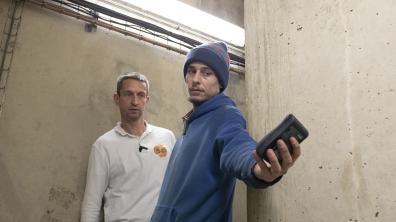 Toute personne extérieure au service radiographie accédant aux casemates de radio-contrôle est répertoriée. Lorsqu’il s’y rend, le directeur qualité Rémy Tintillier (à gauche) est équipé d’un dosimètre opérationnel non nominatif. À sa sortie, il émarge et relève le dosimètre opérationnel, ensuite remis à zéro sous le regard de Jérôme Dervogne (à droite). Par mesure de radioprotection, ce dernier mesure régulièrement les débits de dose autour de la casemate.