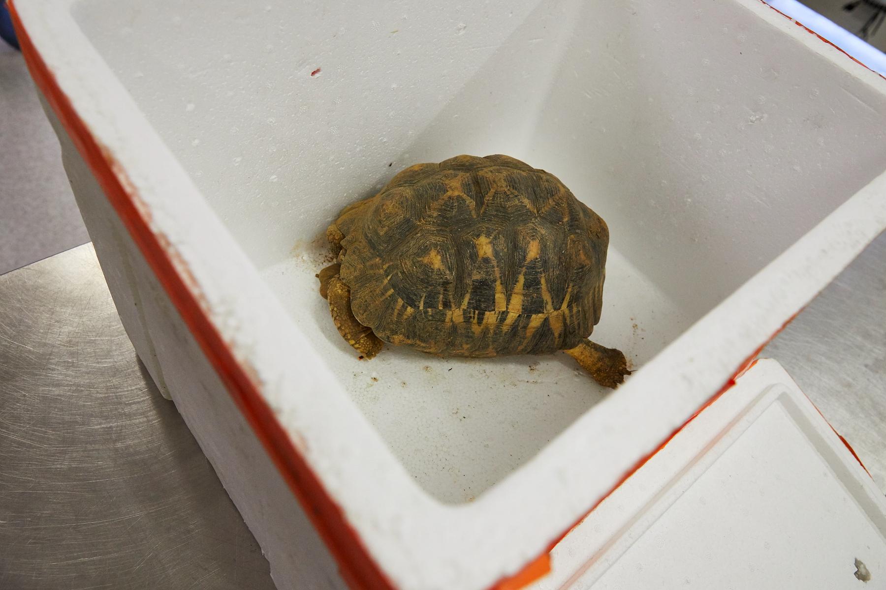 Les petits animaux à radiographier sont amenés à la clinique. Afin de limiter leur stress, ils sont transportés dans des boîtes fermées. Ici, une tortue mâle.