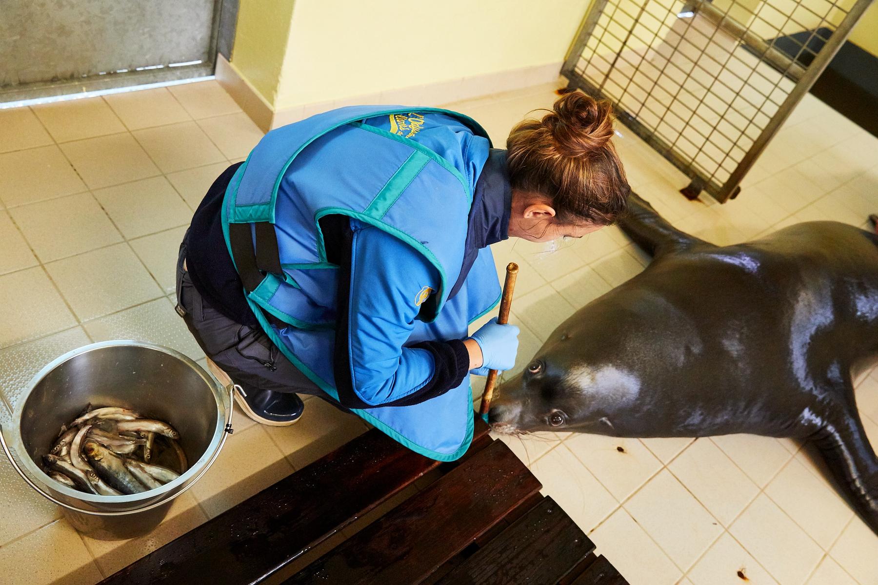 Avant d’installer l’équipement de radiographie, Chloé Martin, une des soigneuses en charge des otaries, acclimate l’animal. Le bâton à bout en mousse permet de focaliser son attention.