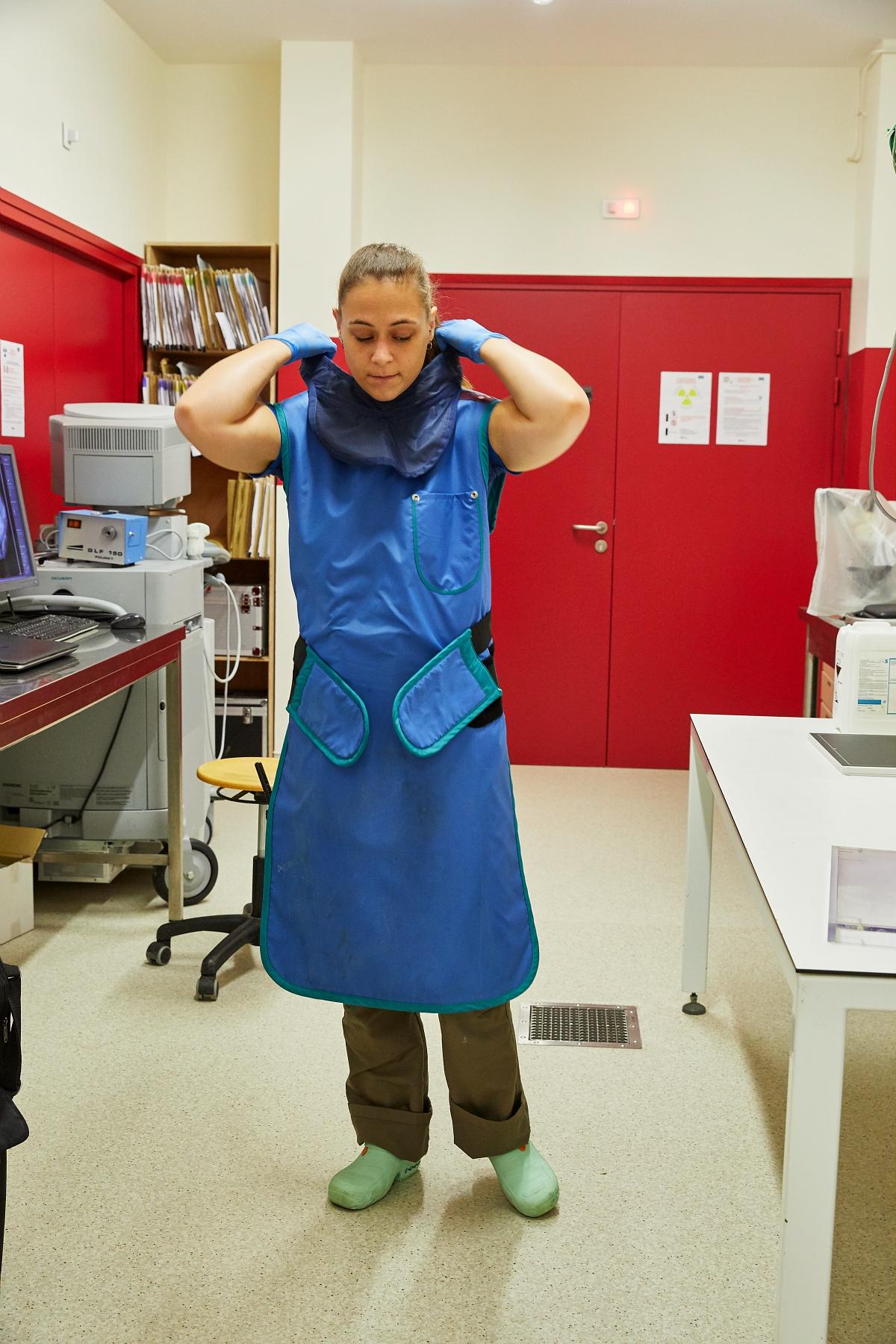 Avant de réaliser la radio, tous les opérateurs enfilent leurs protections plombées - tablier et protège-thyroïde - et s’équipent de dosimètres.