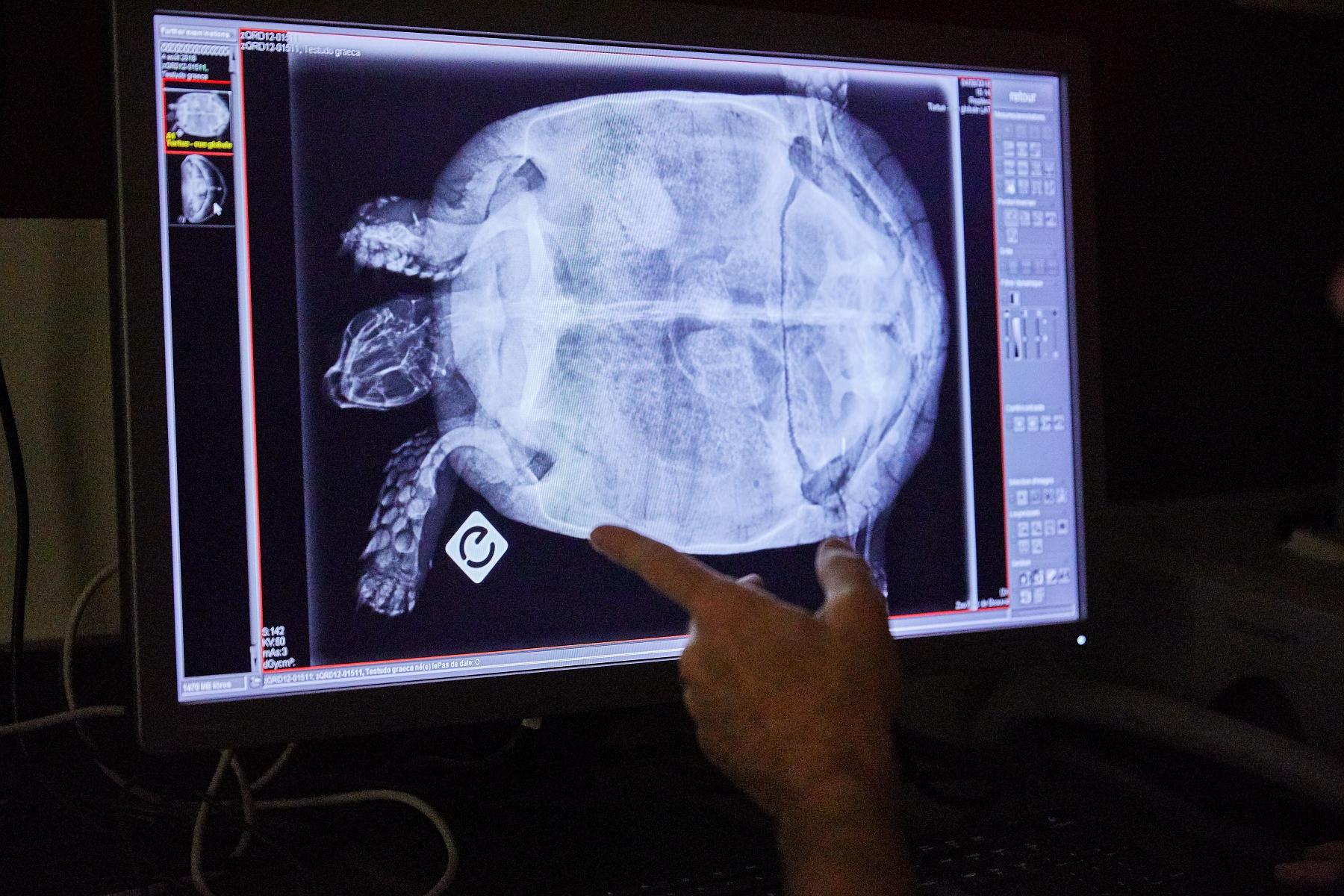 Pour le premier cliché, la tortue est d’abord posée sur le capteur. Le générateur de rayons X est installé en position verticale afin de réduire la surface d’exposition et ne toucher que l’animal.