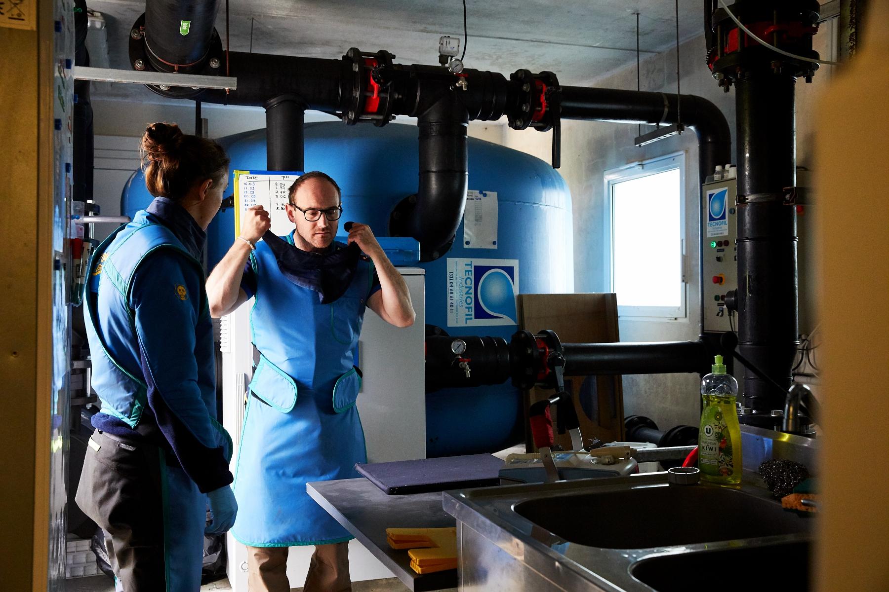 Une fois l’entraînement de l’otarie terminé, les vétérinaires endossent leurs combinaisons plombées dans le hall d’entrée du bâtiment. Ils s’équipent également de dosimètres.