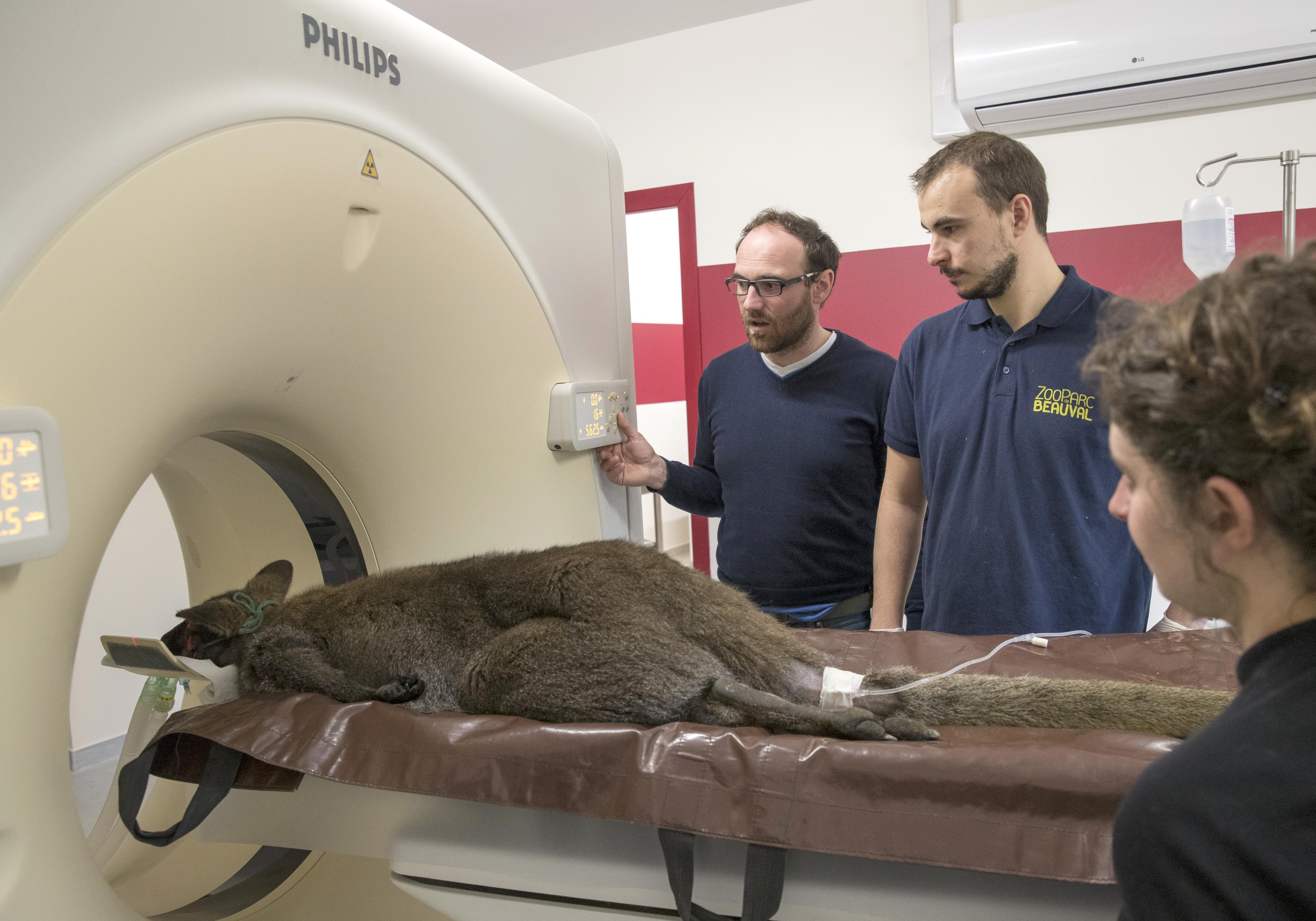 Le ZooParc de Beauval dispose d’un scanner. Il peut accueillir des patients jusqu’à 200 kilogrammes. Au-dessus de la porte d’entrée, des lumières rouge et blanche indiquent s’il est en fonctionnement. Toute ouverture des portes durant l’utilisation coupe immédiatement le générateur. Le personnel opère depuis une salle de contrôle plombée située dans une pièce adjacente.