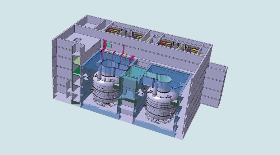 Écorché du principe du réacteur SMR étudié par le consortium français Nuward. Il réunit deux réacteurs de 170 MWe à eau pressurisée. Il est attendu pour 2035. - © TechnicAtome