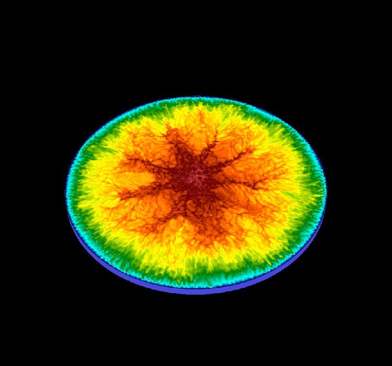Si vous pensez à un œil menaçant tout droit sorti d’un film fantastique, vous n’avez pas complètement tort. Il s’agit bien ici d’une menace, mais bien que loin de celle qui pèse sur la Terre du Milieu – ce continent fictif, théâtre de récits fantastiques ! Ce disque coloré traduit la température à la surface du bain formé par les matériaux fondus lors d’un accident grave à l’intérieur d’un réacteur nucléaire (mélange appelé « corium »). Les éléments fondus sont relocalisés dans le fond de la cuve, constituant ce disque dont le diamètre simulé est de 4 mètres. La zone centrale en rouge est la plus chaude. Ses bords en bleu sont refroidis. Dans le cadre de sa thèse menée au laboratoire d’étude de la physique du corium à l’IRSN et en collaboration avec l’Irphé (Institut de recherche sur les phénomènes hors équilibre), Florian Rein réalise des simulations numériques. Elles portent sur la fine couche de métaux fondus qui se forme en surface du bain de corium. Son danger ? Elle concentre l’énergie issue du cœur du réacteur. Elle entraîne, si elle n’est pas suffisamment refroidie, la rupture de la cuve, qui conduit à la dissémination du corium radioactif dans l’enceinte. La compréhension et la quantification des mouvements au sein de ces métaux liquides et du transport de chaleur qui en résulte sont nécessaires. Elles permettront d’affiner les modèles du code Astec (Accident Source Term Evaluation Code) développé à l’IRSN, qui simule les accidents de fusion du cœur. L’enjeu de sûreté est important pour les réacteurs pour lesquels la rétention du corium dans la cuve est prévue en cas d’accident grave. C’est le cas des futurs SMR (Small Modular Reactor).